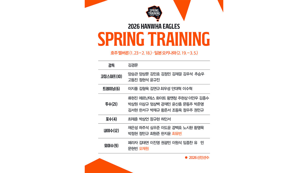 프로야구 한화 이글스는 23일 호주 멜버른으로 1차 스프링캠프를 떠납니다.