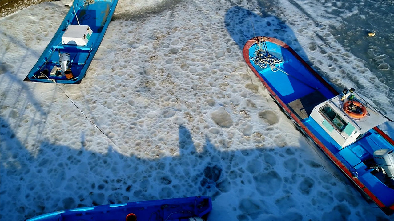 고깃배가 정박한 포구도 꽁꽁 얼어붙었습니다.
