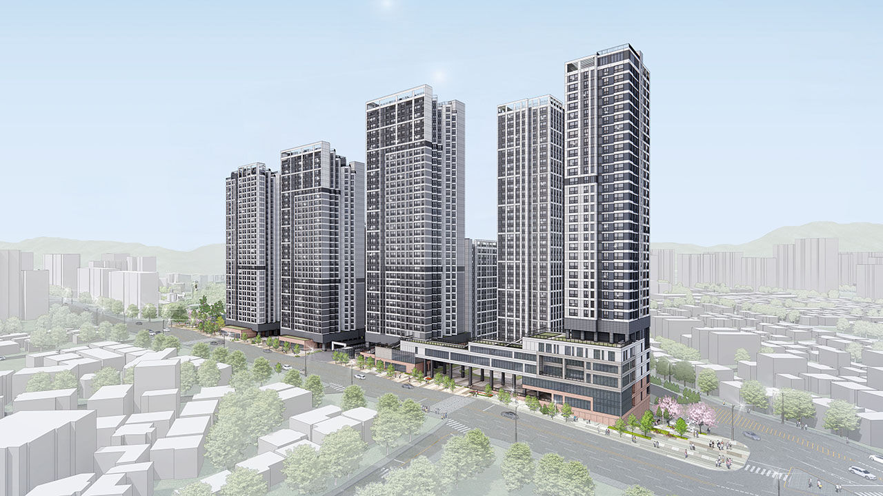 단지는 용마산 조망과 도시 맥락을 반영한 중저·고층 건물 혼합 배치로 개방적인 경관과 통경축을 확보합니다.