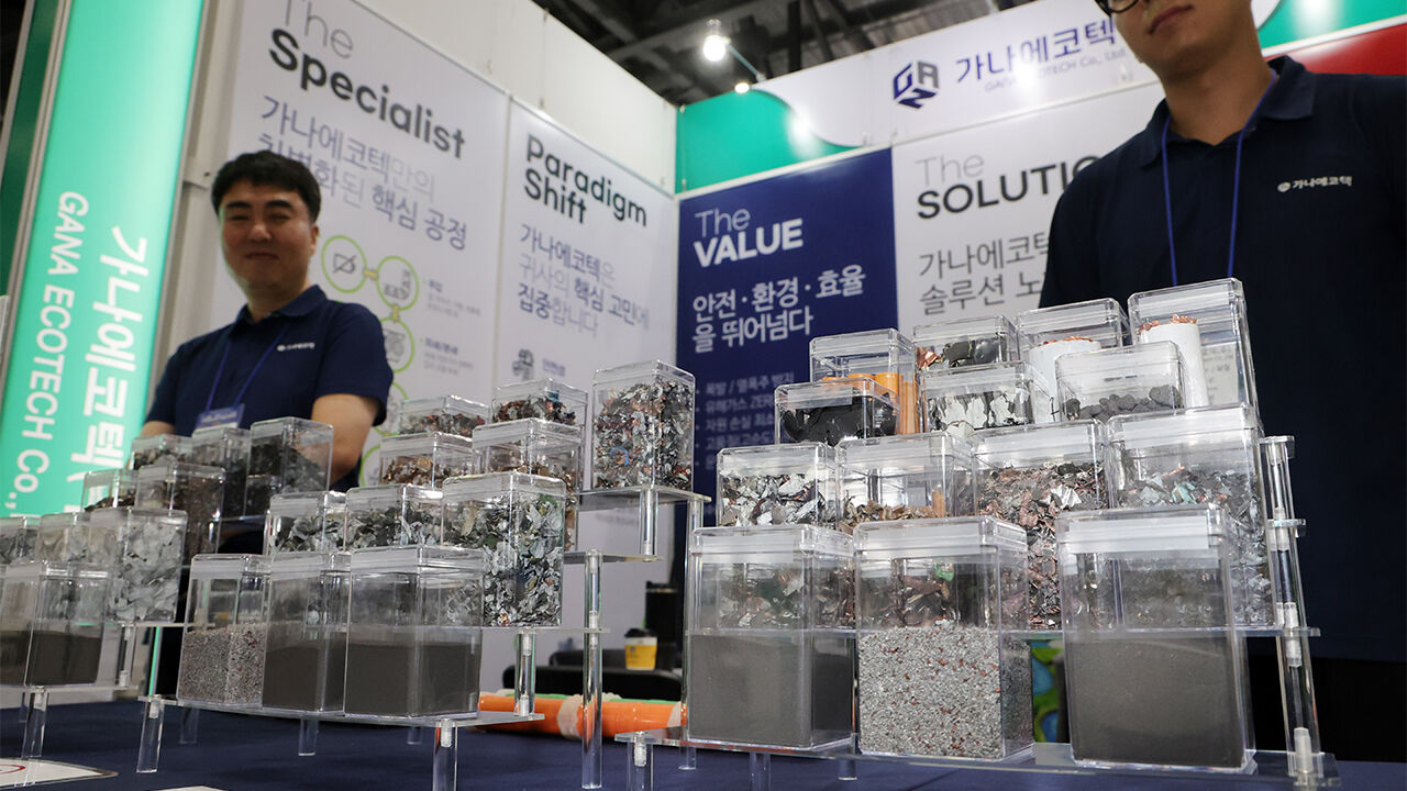 ▲ 작년 8월 10일 경기 고양 킨텍스에서 열린 2025 이차전지 소재·부품 및 장비전에서 한 참가업체가 방전되거나 폐배터리를 재활용하는 기술을 홍보하고 있다