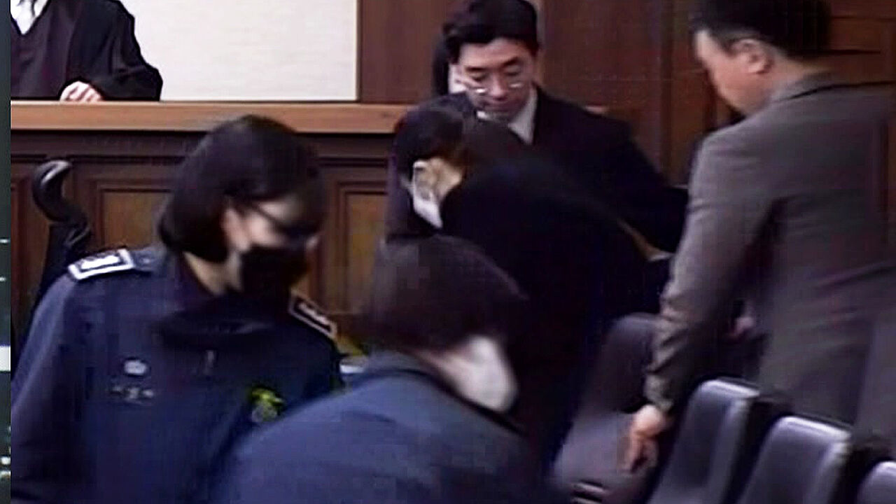 검은색 코트에 안경을 쓴 김건희 여사가 교도관들의 부축을 받으며 법정에 들어왔습니다.