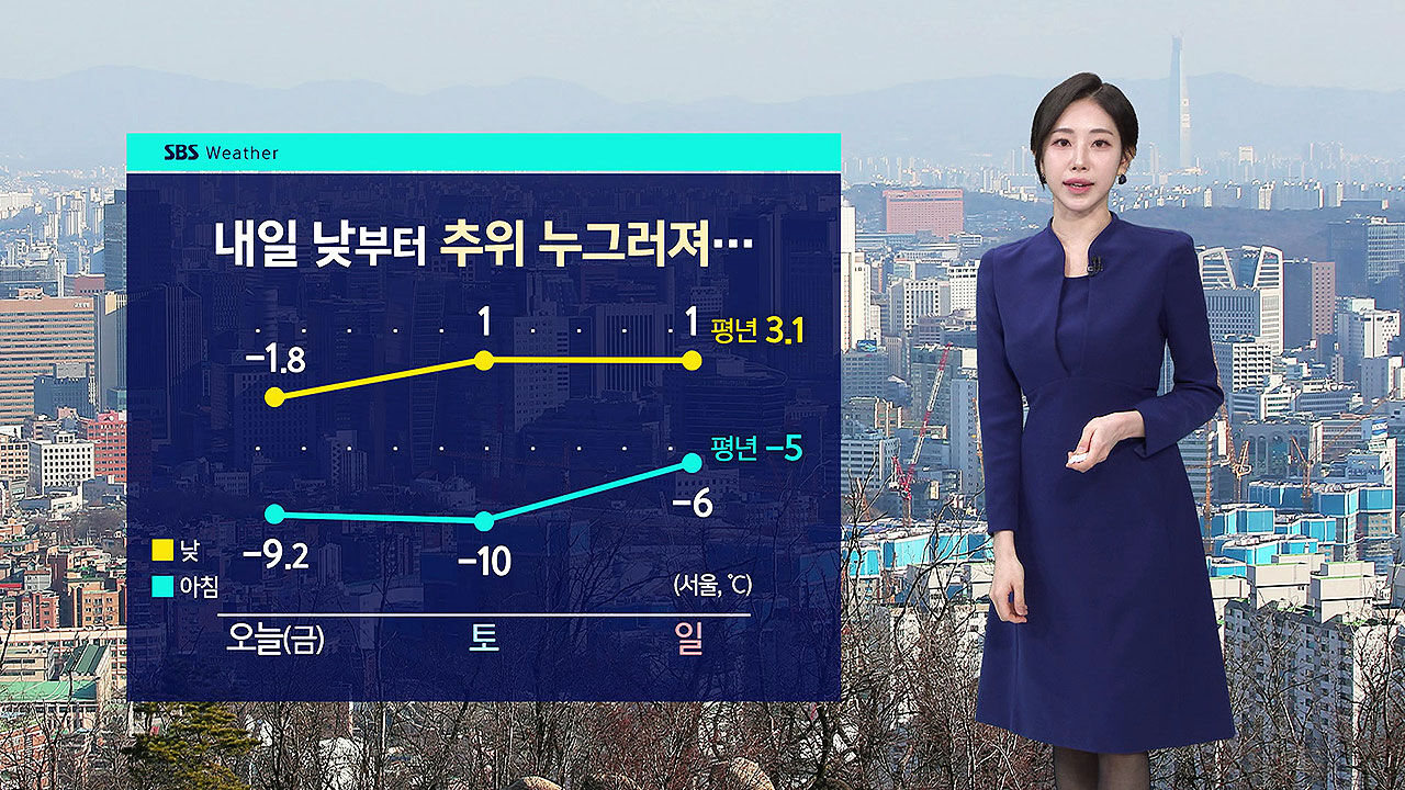 내일 아침 기온은 춘천이 영하 14도, 대전 영하 9도의 강추위가 이어지겠고요, 낮 기온은 서울이 1도, 대전 3도 등 영상권을 회복하겠습니다.