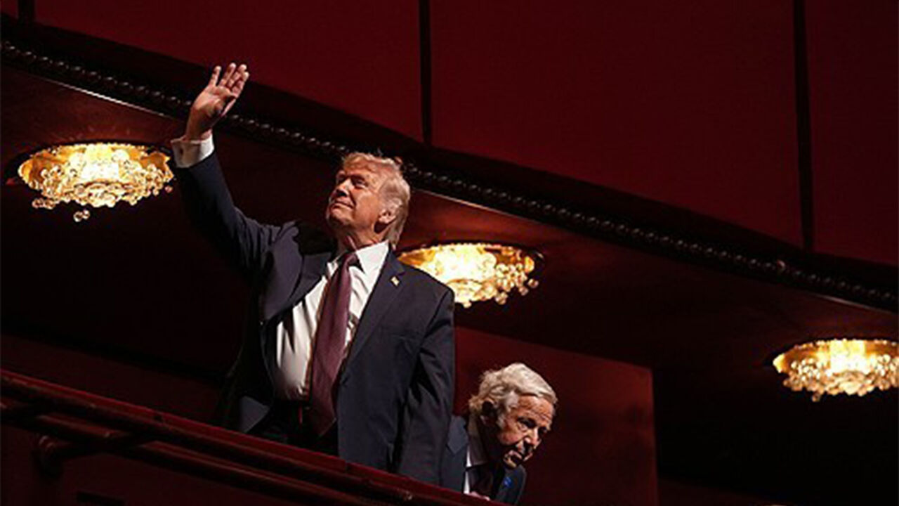 ▲ 29일 미국 수도 워싱턴DC의 케네디 공연예술센터에서 열린 영화 '멜라니아' 개봉 상영 행사가 시작되기 전에 도널드 트럼프 미국 대통령이 손을 흔들고 있다.