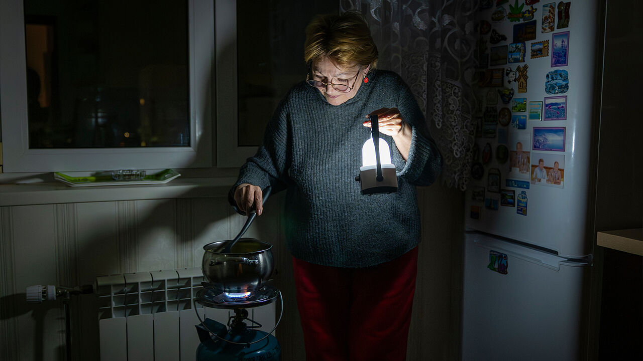 ▲ 우크라이나 키이우에서 정전이 발생한 가운데 한 어머니가 랜턴 라이트에 의지한 채 가스버너로 음식을 준비하고 있다.