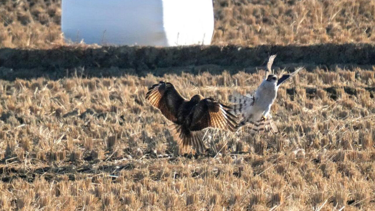 ▲ 먹이다툼하는 참매(오른쪽)와 말똥가리