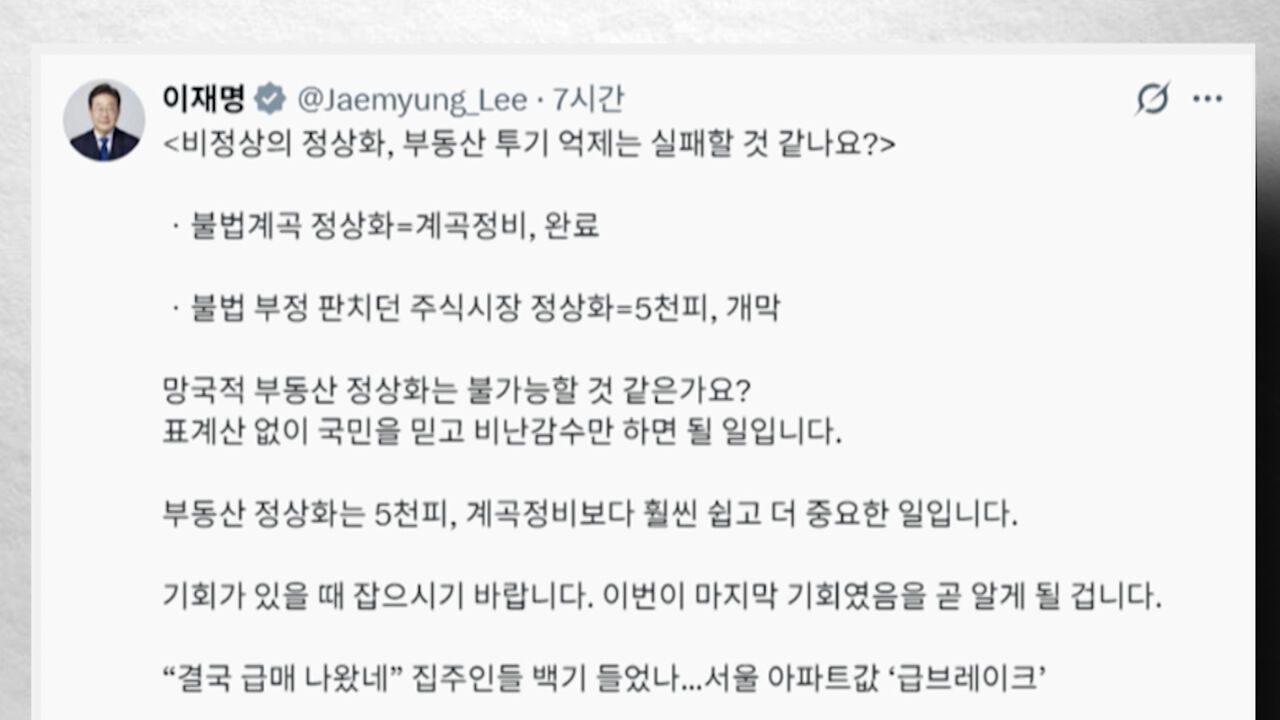1. 이재명 대통령이 연일 SNS를 통해 연일 강도 높은 부동산 대책 메시지를 내고 있습니다. 야권이 정부의 부동산 정책을 비판하자 "투기 옹호를 멈추라"고 반박했습니다.