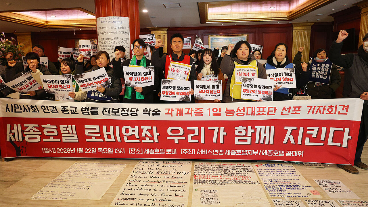 ▲ 지난 1월 22일 서울 중구 세종호텔에서 '세종호텔 로비연좌 우리가 함께 지킨다' 각계각층 1일 농성대표단 선포 기자회견에서 참가자들이 구호를 외치고 있다.