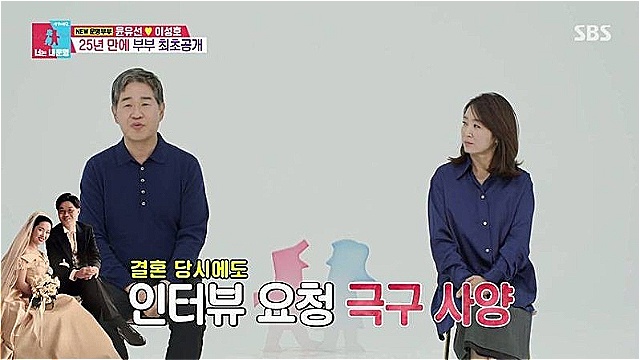 결혼 25년 만의 첫 동반 출연에 부부는 다소 어색한 기색을 감추지 못했다. 윤유선은 "결혼하고 나서부터 인터뷰 요청이 많았는데 공직자 신분이라 안 하다가 오늘 같이 오니까 엄청 어색하다. 제가 데뷔하는 기분"이라며 소감을 밝혔다. 이성호는 결혼식 당시에도 인터뷰를 고사했던 것을 떠올리며 "(인터뷰하면) 검은 머리 파뿌리 될 때까지 잘 살겠다 해야 되는데 제가 법조인으로서 거짓말 못 하겠다고 했다"며 해맑은 모습을 보였다. 반면 윤유선은 "몰랐던 얘기다. 쓸데없이 정직해가지고"라며 어이없는 듯한 웃음을 지어 보였다. 그럼에도 이성호는 멈추지 않고 "그렇다고 사실대로 말할 순 없지 않냐"고 능청을 이어갔고, 이에 윤유선은 "그땐 제가 이런 얘기 참 재밌어했다"며 반전 취향(?)을 드러냈다.