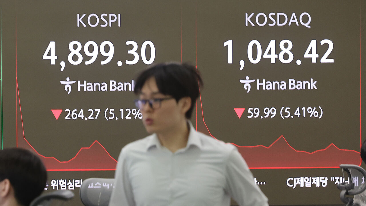 ▲ 코스피가 장중 5% 넘게 급락해 4,900선이 깨진 6일 서울 중구 하나은행 딜링룸에서 직원이 업무를 보고 있다.