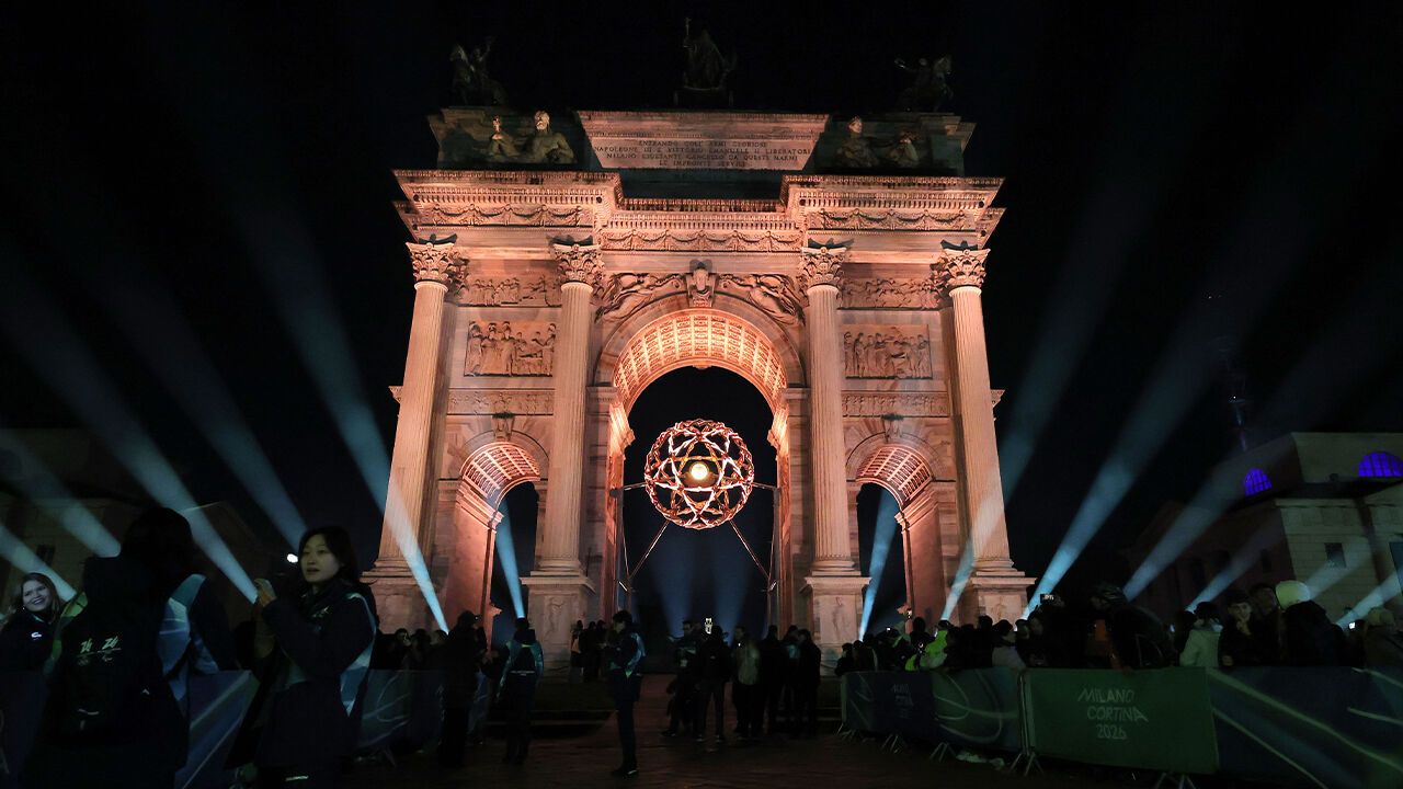 ▲ 2026 밀라노·코르티나담페초 동계올림픽이 개막한 6일(현지시간) 이탈리아 밀라노 '평화의 아치'(아르코 델라 파체·Arco della Pace) 성화대에 점화된 성화가 타오르고 있다.
