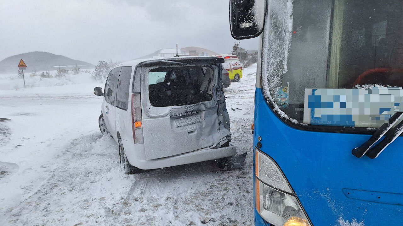 제주 새별오름 인근 버스-승합차 눈길 사고…3명 병원 이송