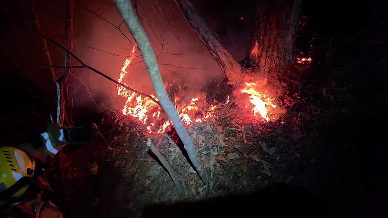 어두운 산속에서 진화대원들이 시뻘건 불길과 사투를 벌입니다.