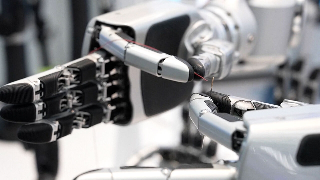 미세한 바늘 귀에 실을 꿰는 휴머노이드 로봇의 손놀림을 시진핑 중국 국가주석이 유심히 살펴봅니다.