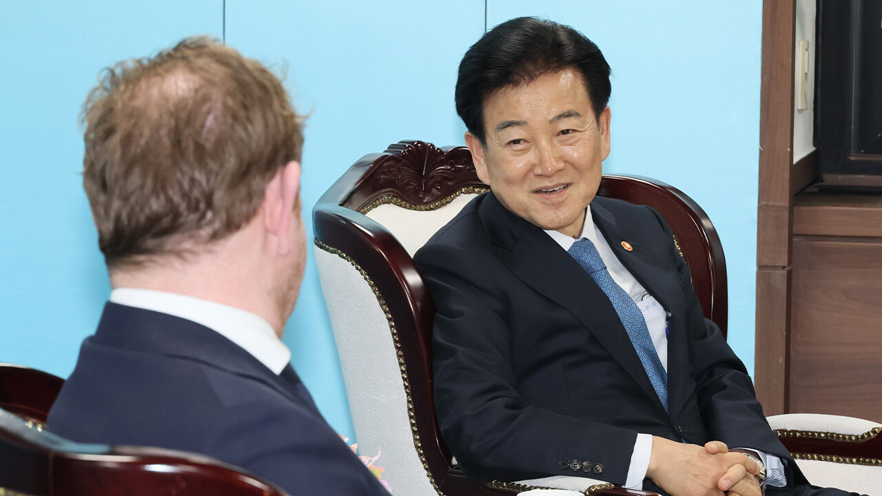 ▲ 정동영 통일부 장관이 10일 서울 종로구 정부서울청사에서 다비드 반 베일 네덜란드 외교장관과 면담하고 있다