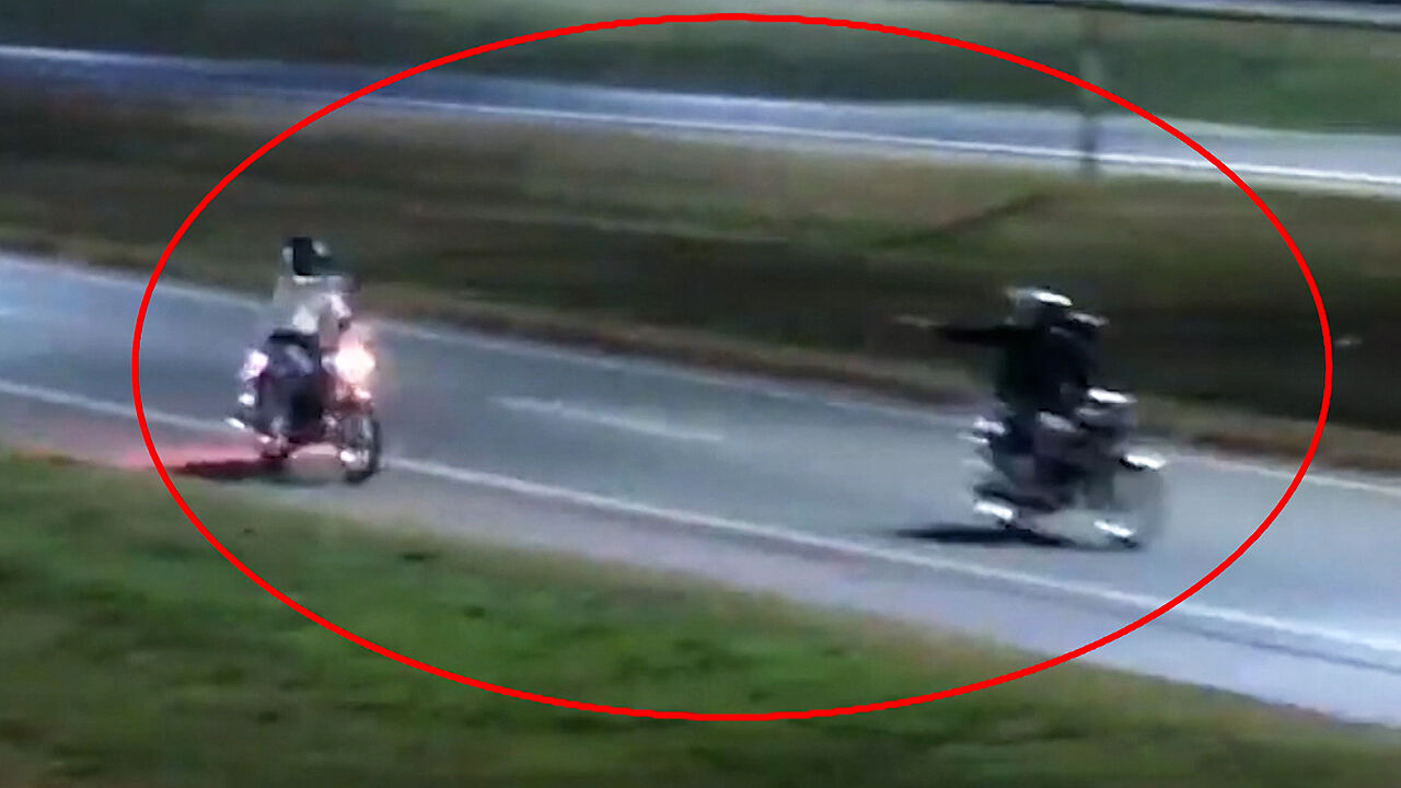 그런데 갑자기 앞서 달리던 오토바이에서 뒤쫓아오는 오토바이를 향해 총을 발사합니다.