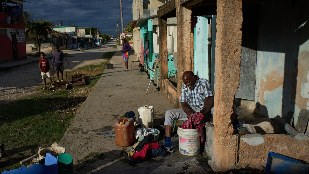 ▲ 쿠바 산타크루즈 델 노르테에서 예정된 정전 시간 동안 거리에서 옷을 세탁하고 있다.