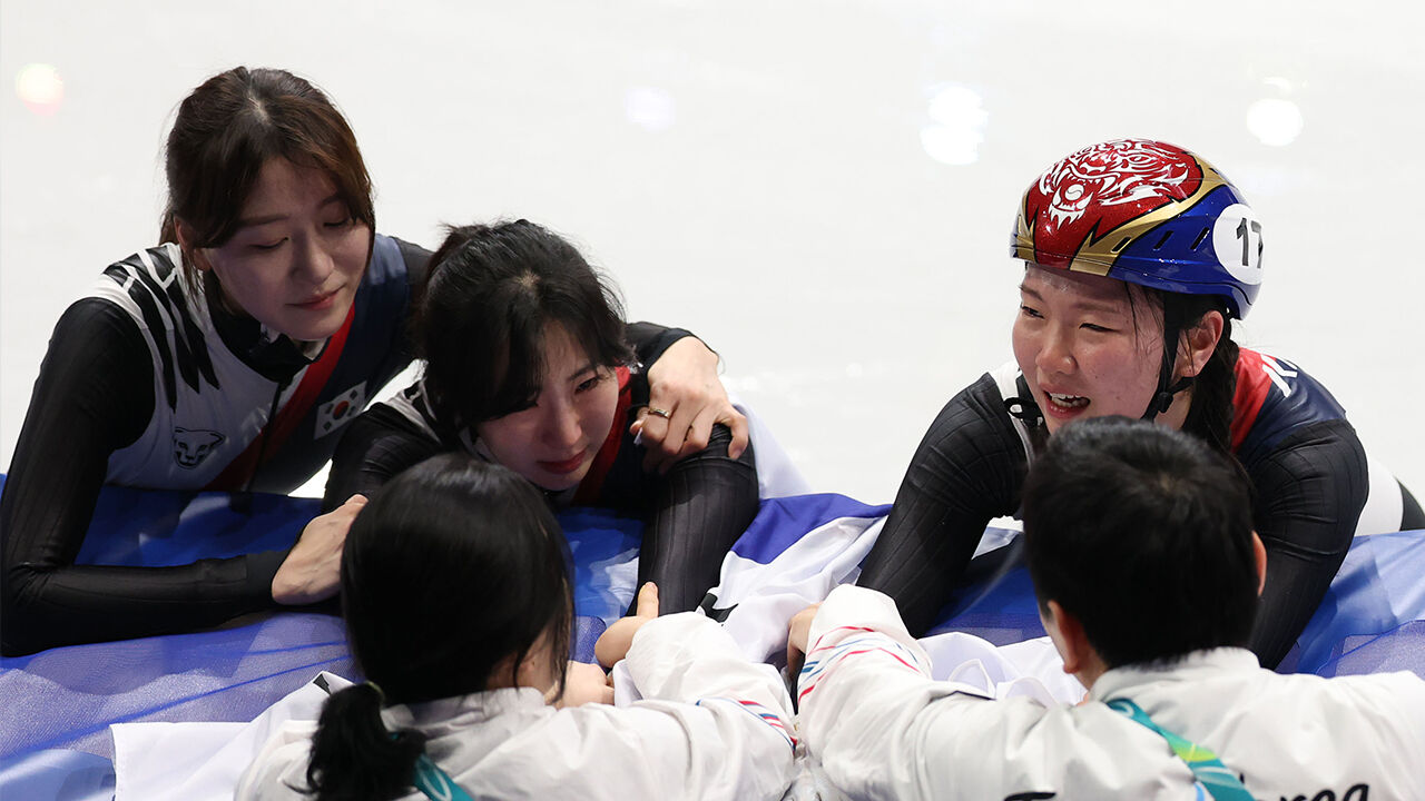 ▲ 18일(현지시간) 2026 밀라노-코르티나담페초 동계올림픽 쇼트트랙 여자 3000m 계주에서 금메달을 따낸 한국대표팀 심석희, 이소연, 노도희가 눈물을 흘리고 있다.