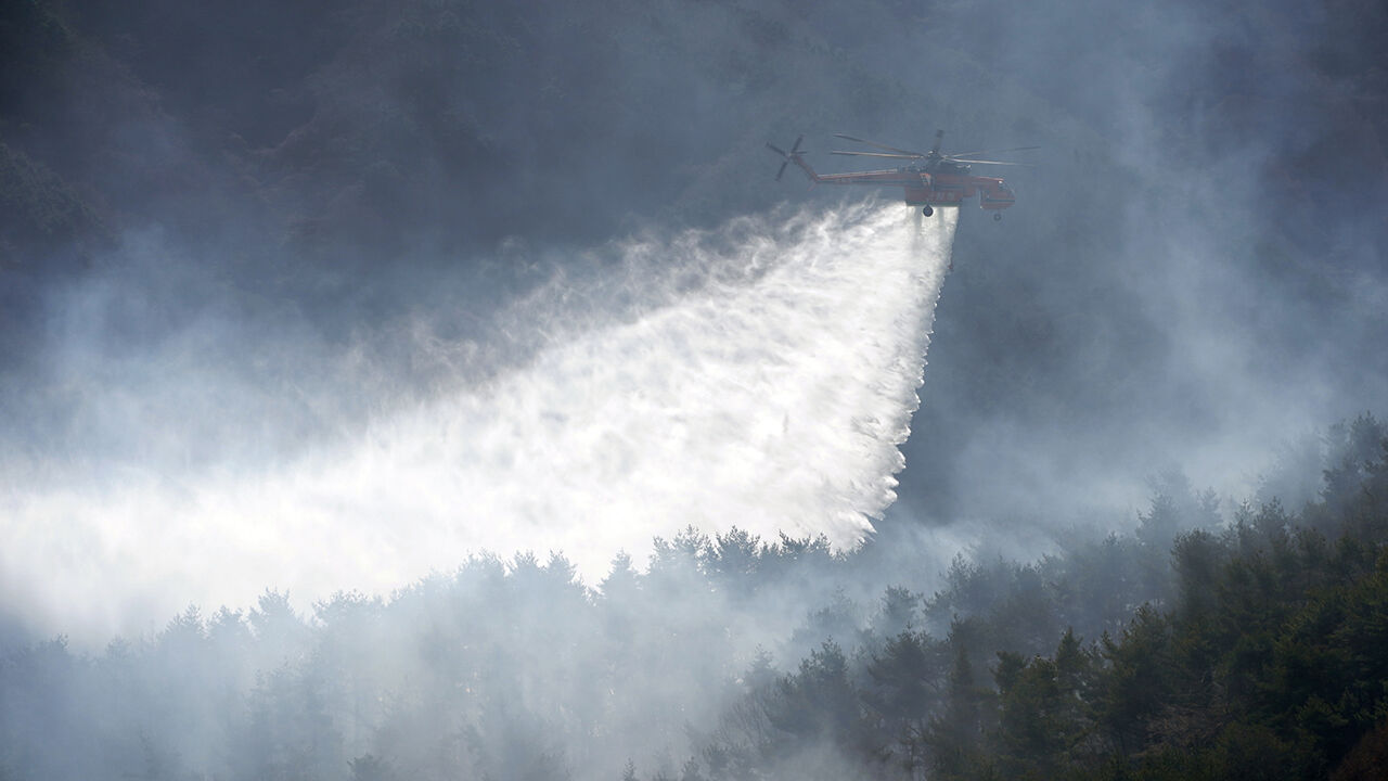 ▲ 산림 당국 헬기가 23일 경남 함양군 마천면에서 산불 진화 작업을 하고 있다.