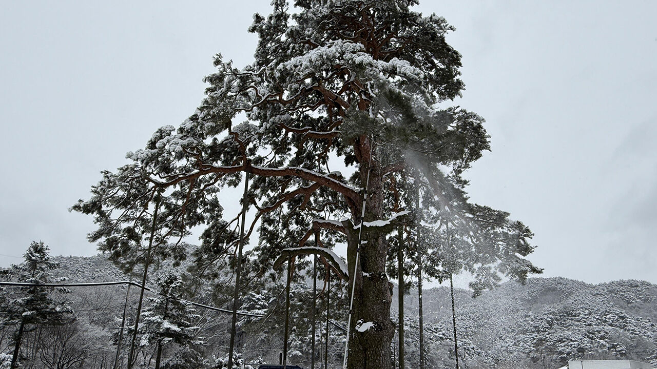 24일 충북 남부 지역에 많은 눈이 내린 가운데 보은군이 속리산 정이품송(천연기념물 130호)의 가지가 또다시 부러지는 불상사를 막기 위해 긴급 제설 작업에 나섰습니다.