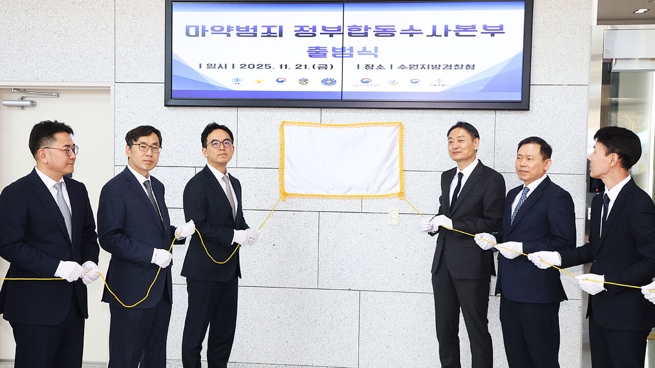 ▲ 구자현 대검찰청 차장검사(검찰총장 직무대행)가 지난해 11월 21일 경기도 수원시 영통구 수원지방검찰청에서 열린 '마약범죄 정부합동수사본부' 출범식에서 참석자들과 현판식을 하고 있다.