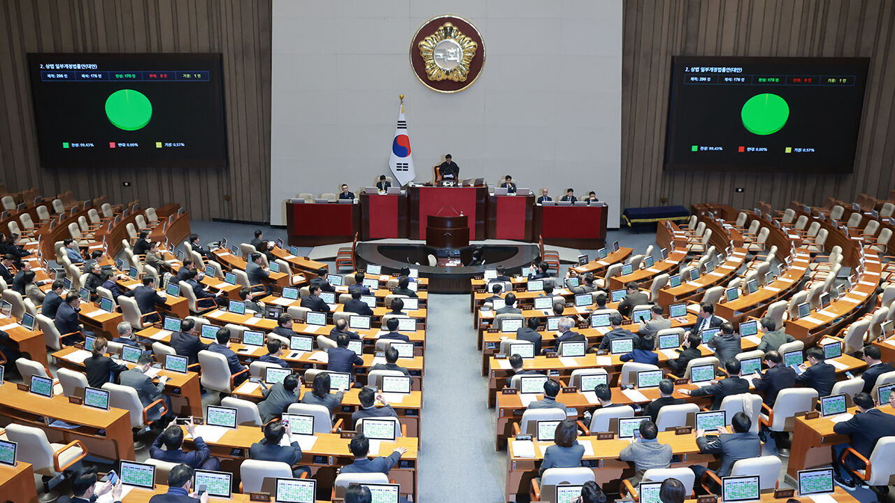 ▲ 25일 국회에서 열린 2월 임시국회 본회의에서 이른바 '3차 상법 개정안'이 국민의힘 의원들의 불참 속에 통과되고 있다.