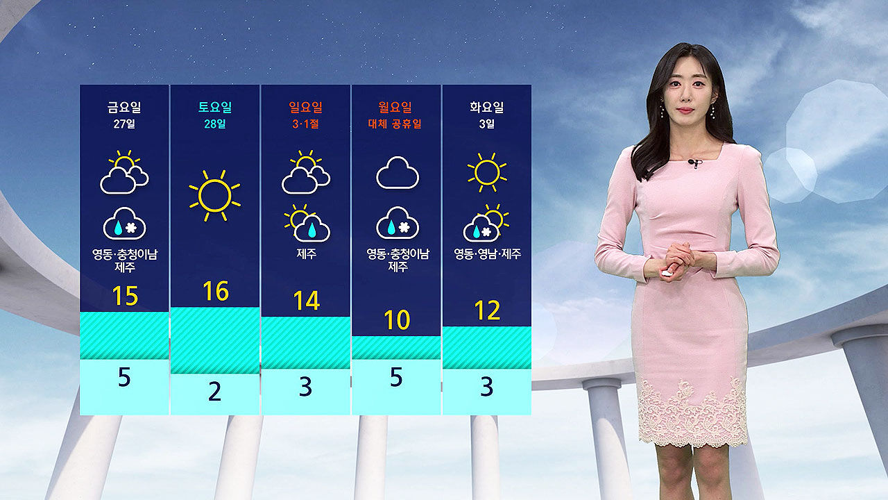 다가오는 금요일과 다음 주 월요일에는 영동과 충청 이남 지역을 중심으로 눈비 예보가 있습니다.