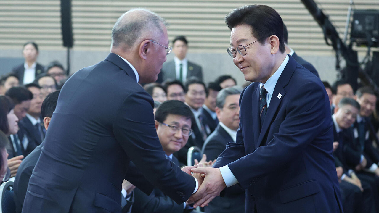 ▲ 이재명 대통령이 27일 전북 군산새만금컨벤션센터에서 열린 새만금 로봇·수소·AI 시티 투자협약식에서 축사를 마친 뒤 정의선 현대차그룹 회장과 악수하고 있다.
