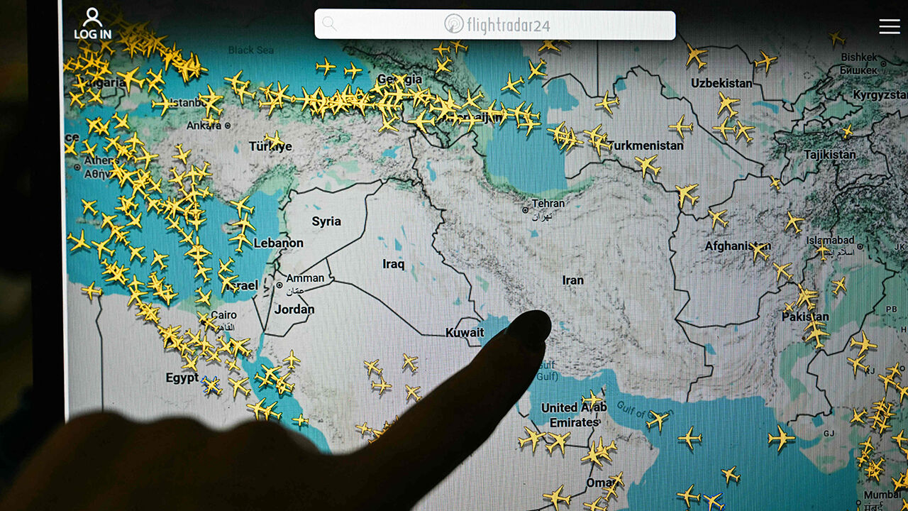 ▲ 현지 시간 1일 이란과 이라크 상공을 피해 비행하는 민간 항공기들의 모습이 담긴 '플라이트레이더 24(Flightradar 24)' 웹사이트 모습