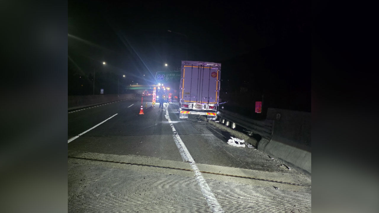 두 차량은 충돌을 피하기 위해 급히 방향을 틀었고 화물차는 갓길에 세워진 도로 안내 표지판을, A 씨의 차량은 중앙분리대를 들이받았습니다.