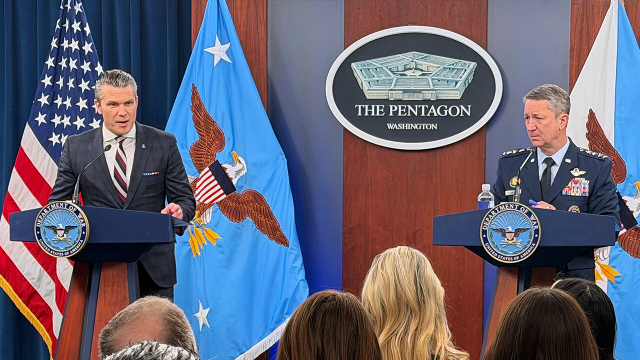 ▲ 피트 헤그세스 미국 국방부(전쟁부) 장관이 4일(현지시간) 미 국방부 청사에서 댄 케인 합참의장과 함께 브리핑을 하고 있다.