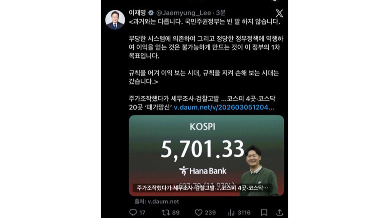 이 대통령은 엑스(X·옛 트위터)에 국세청이 주가 조작 등으로 주식 시장을 교란한 27개 기업과 관련자 200여 명에 대해 세무조사를 벌여 2천576억 원을 추징하고 관련자를 검찰에 고발했다는 내용의 보도를 링크하고 이같이 적었습니다.