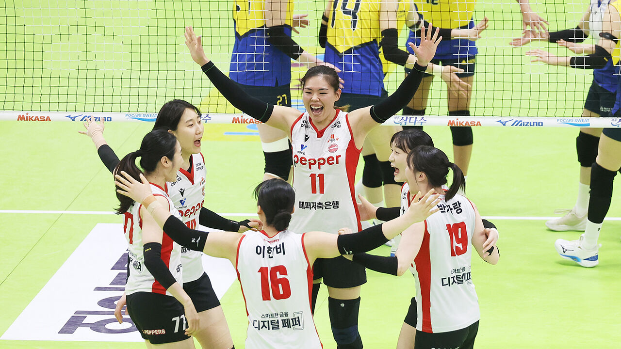 ▲ 8일 현대건설 힐스테이트와 페퍼저축은행 AI페퍼스의 경기. 득점에 성공한 페퍼저축은행 선수들이 기뻐하고 있다.