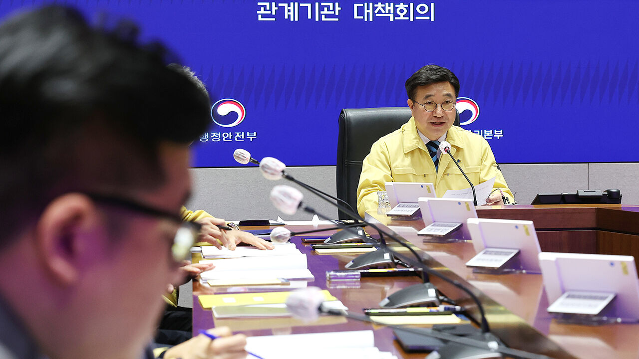 ▲ 윤호중 행정안전부 장관(오른쪽)이 11일 서울 종로구 정부서울청사 상황센터에서 BTS 컴백 행사 인파 안전관리 관계기관 대책회의를 주재하고 있다