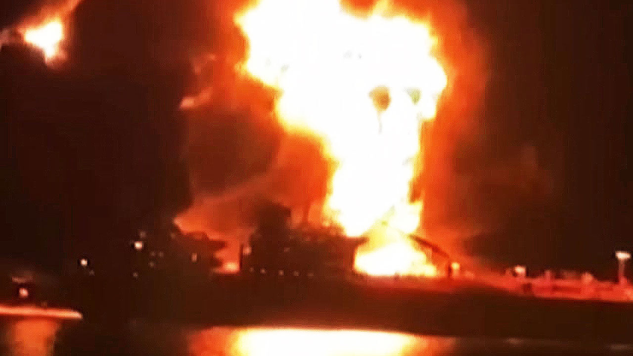바다 한복판 유조선에서 거대한 불기둥이 치솟아 오르고, 유출된 기름에 해수면 위에도 불이 붙었습니다.
