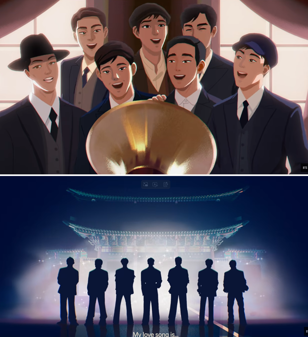 The scene then jumps to the present day, where BTS takes the stage. Bathed in purple lights, the members perform to roaring cheers in a packed arena. The video closes with BTS standing in front of Gwanghwamun Plaza, underscoring their message of hope and comfort through music.