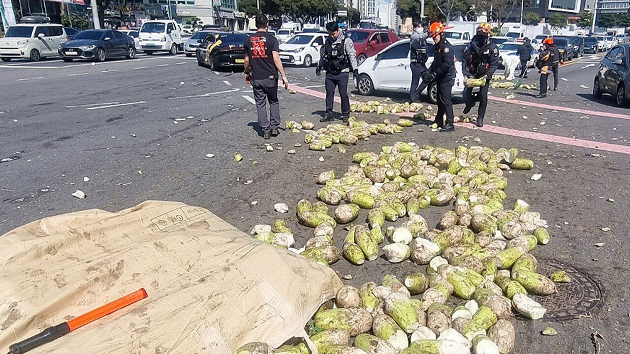 13일 제주도소방안전본부와 제주경찰청에 따르면 이날 오후 2시 10분 제주시 노형오거리에서 25t 트럭 적재함에 실려 있던 월동무가 도로에 떨어졌다는 신고가 접수됐습니다.