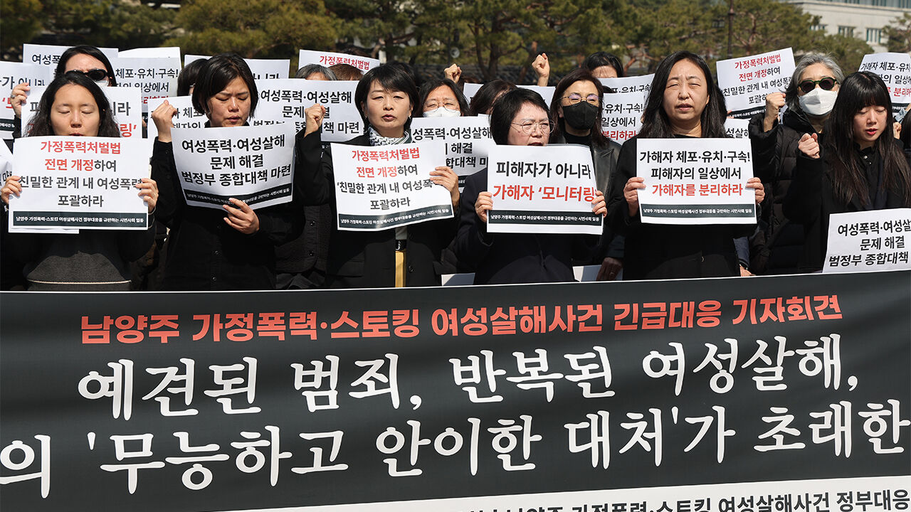 ▲ 17일 서울 청와대 분수대 앞에서 남양주 가정폭력ㆍ스토킹 여성살해사건 긴급대응 기자회견이 열리고 있다.