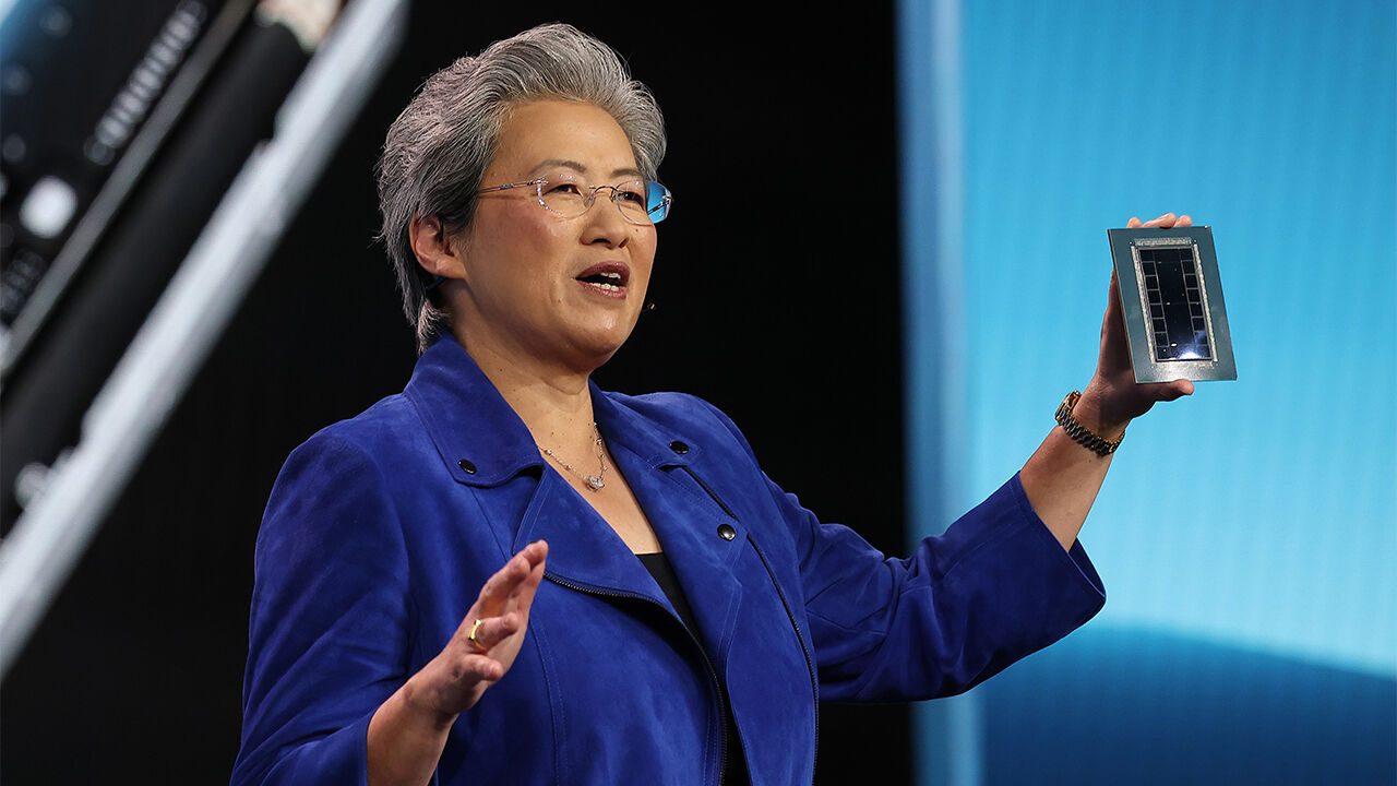 ▲ 리사 수 AMD CEO가 CES 개막을 하루 앞둔 5일(현지시간) 미국 라스베이거스 베네시안 호텔에서 키노트 연설하며 AI 칩을 들고 있다.