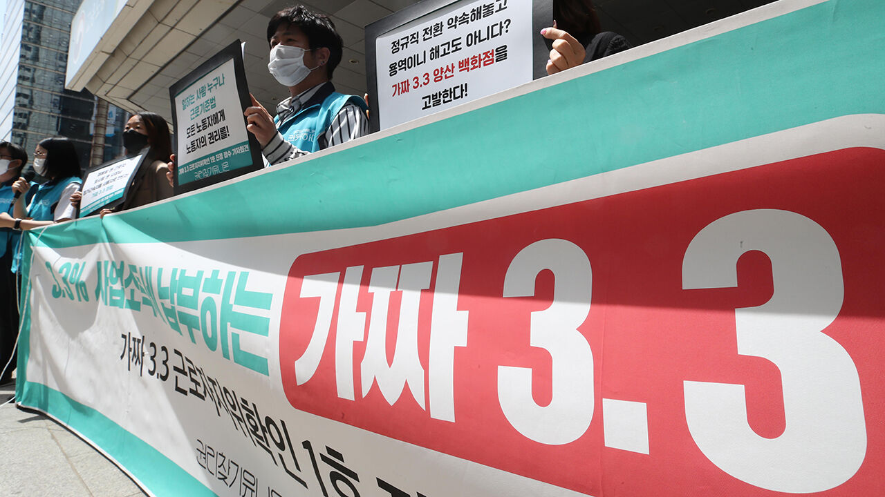 ▲ 지난 2021년 5월 12일 서울 중구 서울지방고용노동청 앞에서 권리찾기유니온 주최로 열린 '가짜 3.3 근로자지위확인 1호 진정 접수' 기자회견에서 참석자들이 손팻말을 들고 있다