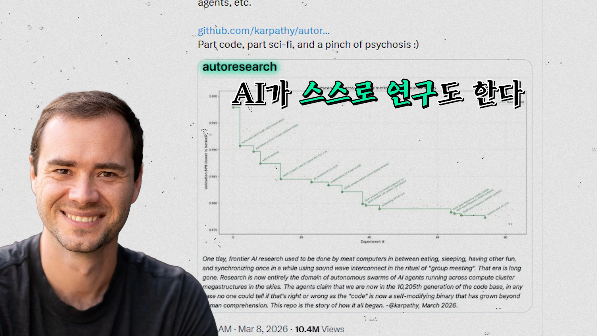 바이브 코딩이 등장한 지 1년. 이제는 단순히 코딩만의 이야기로 그치지 않습니다. 안드레이 카파시가 지난달에 '오토 리서치'라는 프로젝트를 공개했어요. 이름에서 알 수 있듯이 AI가 스스로 연구하는 시스템이죠. 사람이 하는 일은 '이런 방향으로 실험해 보세요'라고 적는 것뿐입니다. 그러면 AI가 알아서 코드를 수정하고, 모델을 학습시키고, 성능 향상을 위해 실험을 반복합니다.