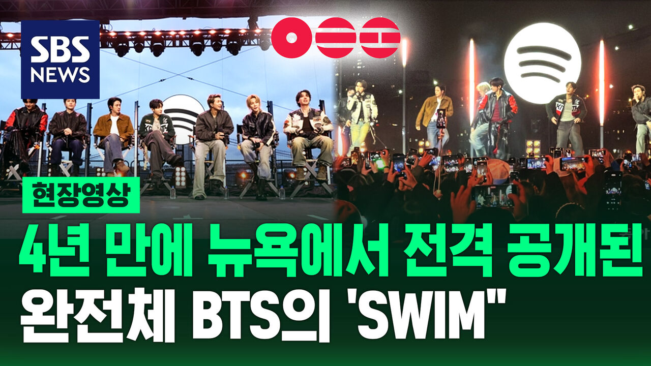 방탄소년단이 현지시간 23일 음원 플랫폼 스포티파이가 미국 뉴욕 맨해튼 피어 17 루프탑에서 개최한 특별 행사 '스포티파이 X BTS : 스윔사이드'에 참석했습니다. 라스베이거스에서 열린 '퍼미션 투 댄스 온 스테이지'로 마지막으로 미국 무대에 완전체로 섰던 2022년 4월 이후 4년 만의 무대입니다. 노래가 시작되자 팬들의 함성이 터져 나왔습니다. 현장의 분위기는 영상으로 전하겠습니다.