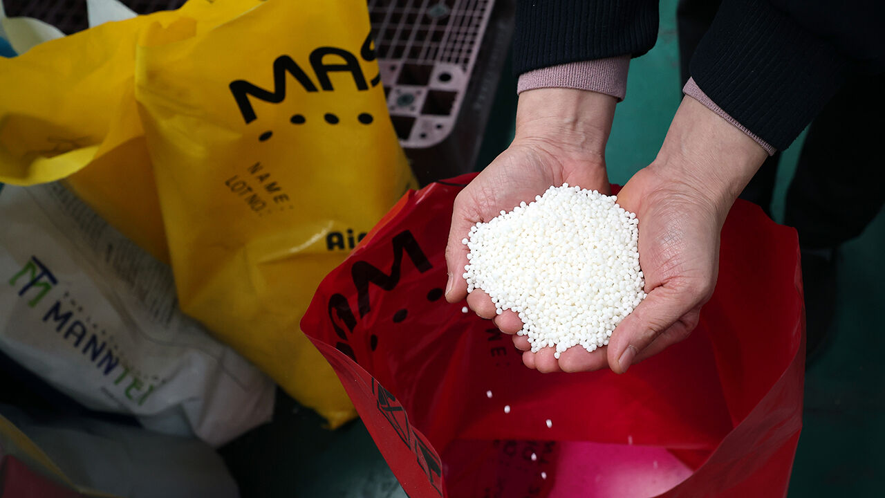 ▲ 24일 경기 안산시의 한 플라스틱 필름 제조 공장의 원료 창고에서 관계자가 폴리에틸렌 등 원료를 보여주고 있다