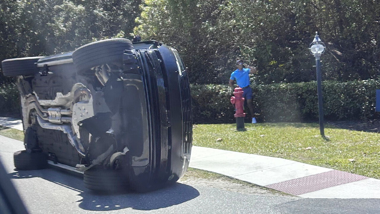 ▲ 전복된 차량 옆에 서 있는 타이거 우즈