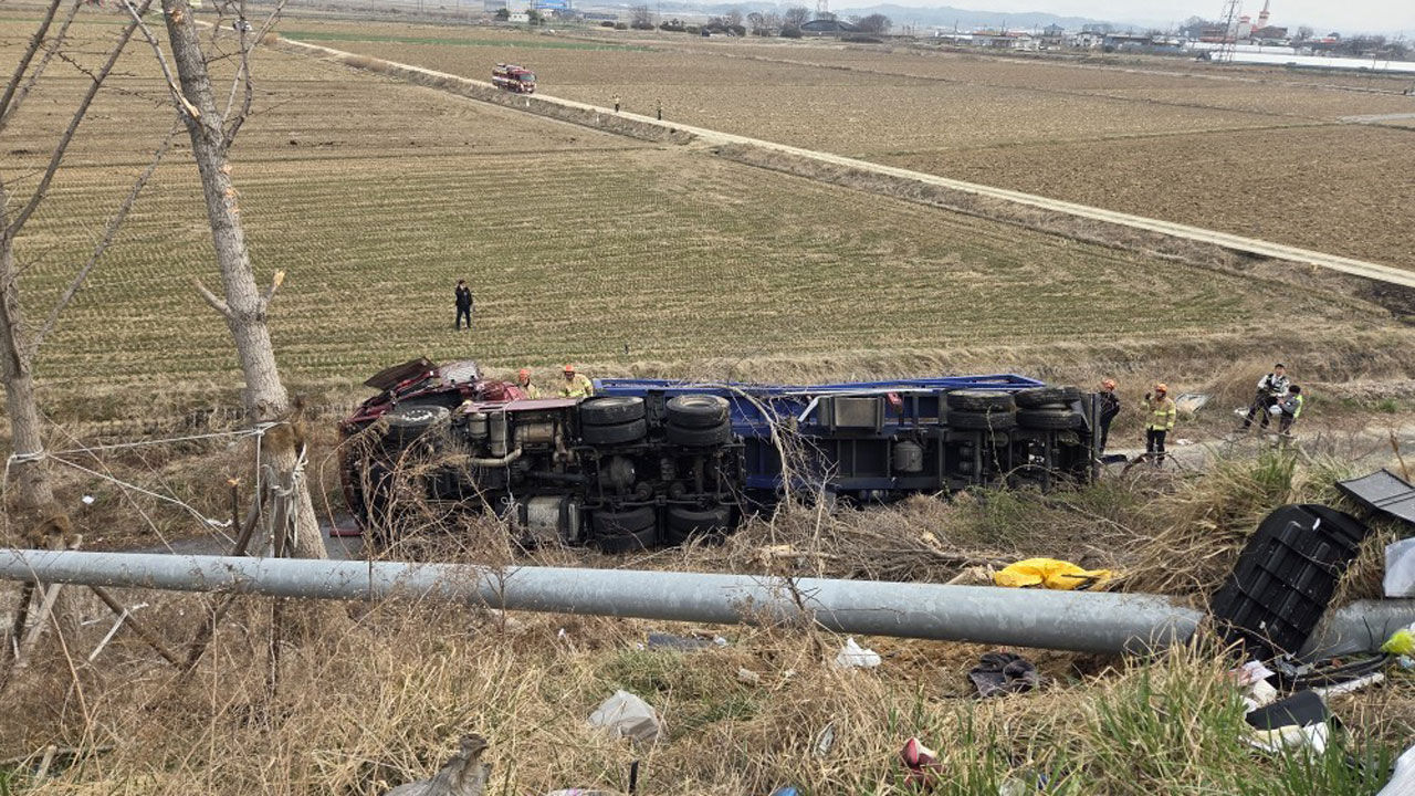 오늘(29일) 오전 10시 20분쯤 충남 논산천안고속도로 연무 분기점 인근에서 25톤 탱크로리 화물차가 도로 밖으로 추락해 전도됐습니다.
