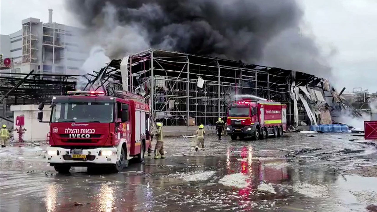 현지 시간 29일 오후 이스라엘 베르셰바 남쪽 네오트호바브 산업단지의 한 공장 화학물질 저장시설이 이란 미사일 파편에 훼손되면서 큰 불이 난 모습입니다.