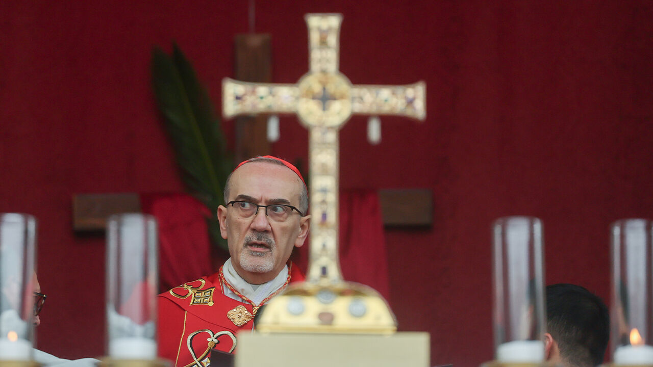 ▲ 29일(현지시간) 예루살렘 라틴 총대주교 피차발라 추기경이 종려주일 기도를 이끌고 있다.