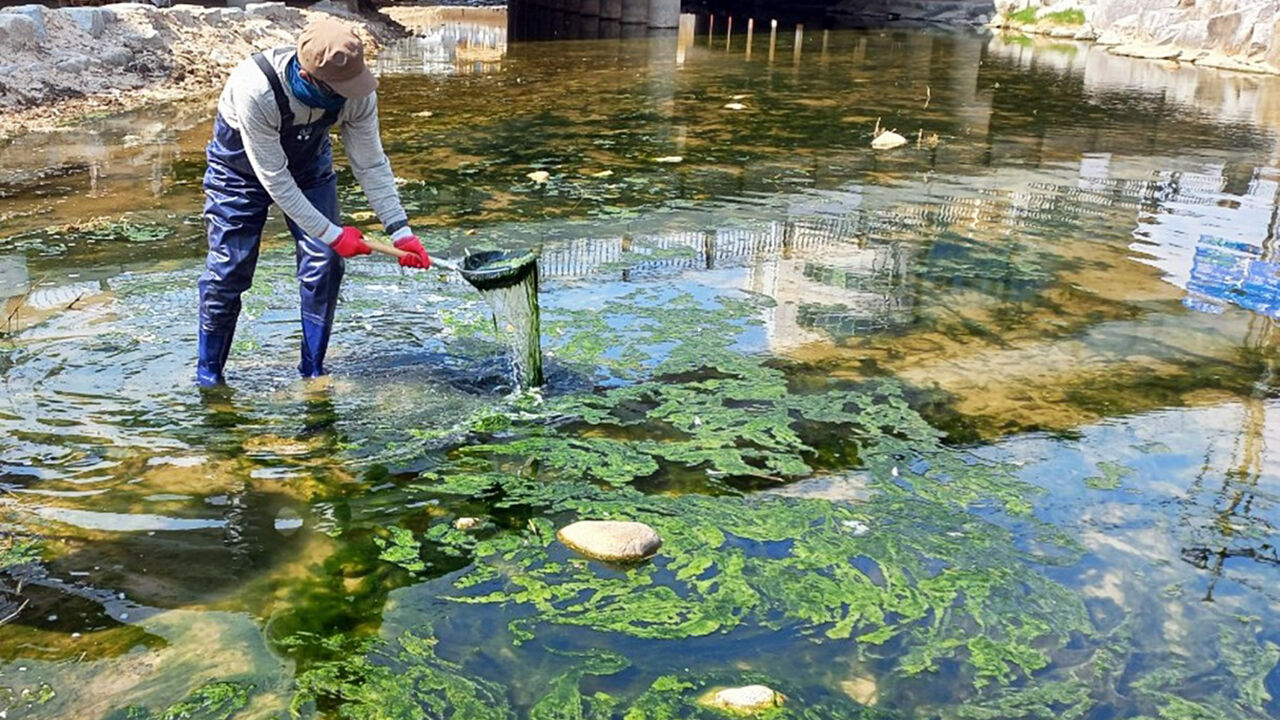 ▲ 경기 의정부 도심 하천에 예년보다 두세 달 일찍 녹조가 발생해 시청 직원들이 수작업으로 걷어내고 있다.