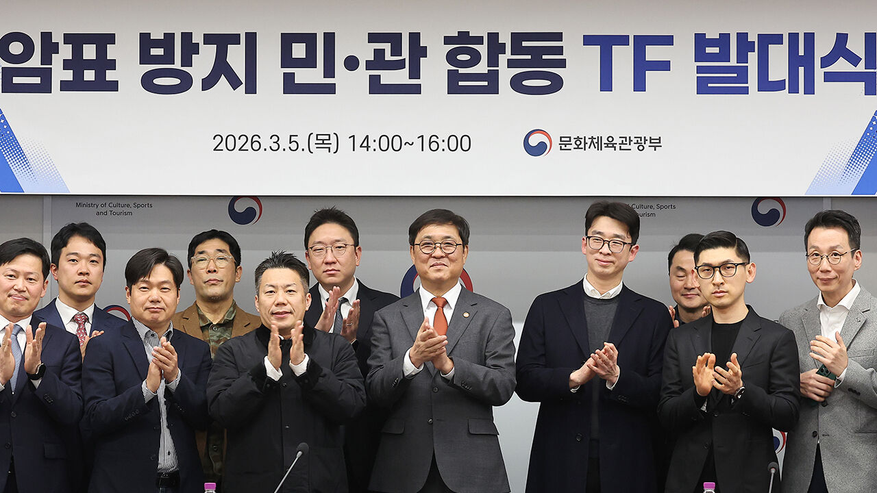 ▲ 최휘영 문화체육관광부 장관(가운데)과 참석자들이 지난달 5일 '공연·스포츠 암표 방지 민·관 합동 TF 발대식'에서 기념 촬영을 하며 손뼉 치고 있다