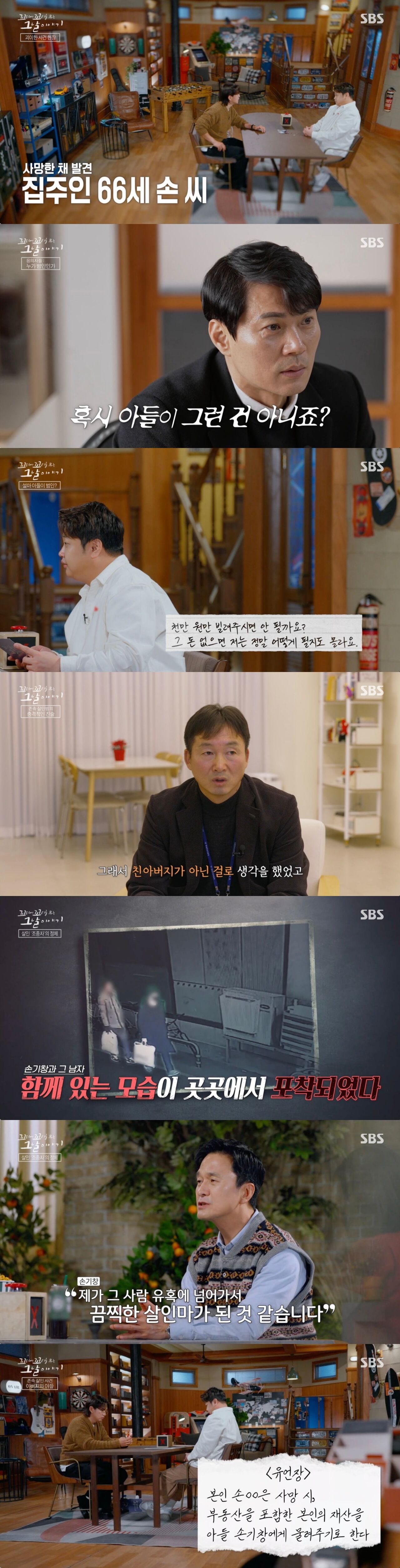 그리고 방송은 피해자의 집에 있던 문서의 내용을 공개하며 답을 대신했다. 피해자의 집에는 그의 유언장이 남아있었다. 자신이 사망한 후 재산을 모두 아들 손기창에게 물려주겠다는 내용의 유언장은 씁쓸함을 남겼다.
