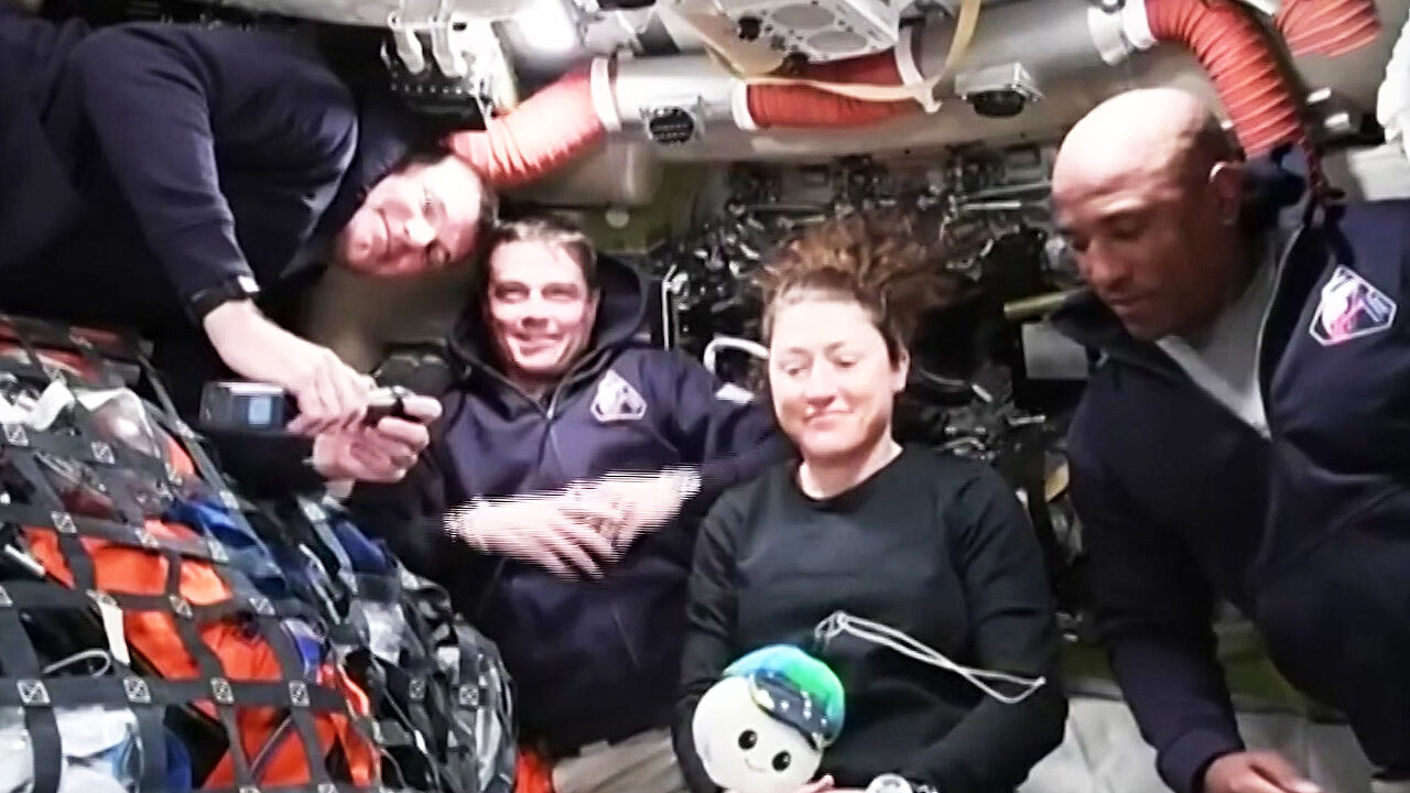 지름이 5m로 좁은 공간, 첫 화상통화가 시작되자 오리온 속 우주인들이 옹기종기 모여 밝은 표정으로 인사를 건넵니다.